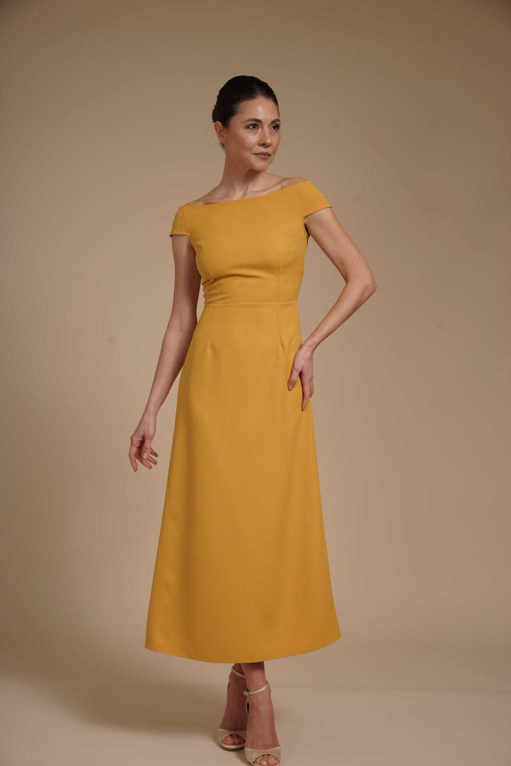 Designul cu decolteu bardot pune în valoare linia umerilor, iar bustul construit pe cusături discrete conturează silueta cu eleganță. Croiala A-line echilibrează proporțiile și alungește vizual, transformând rochia într-o alegere versatilă pentru apariții sofisticate.