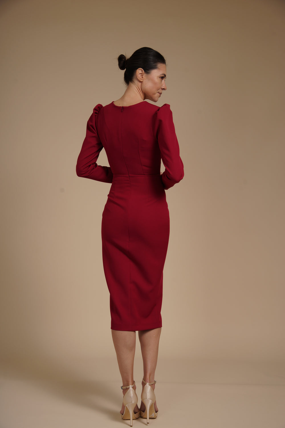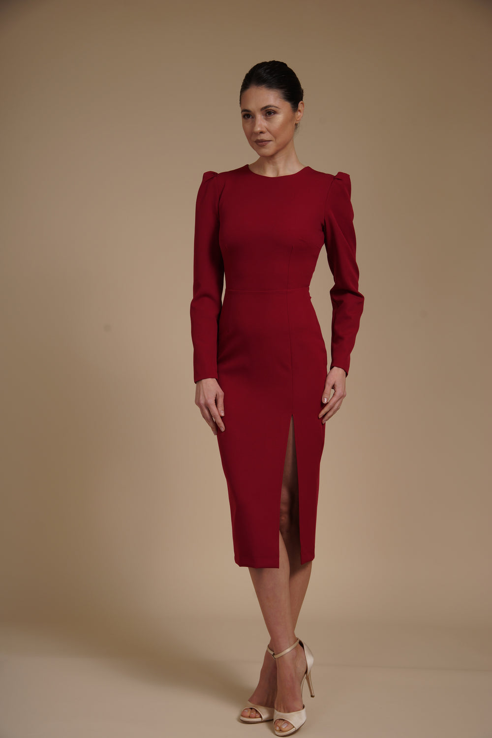 Rochie eleganta midi conica din crep elastic Bordeaux, cu maneci lungi si crapatura