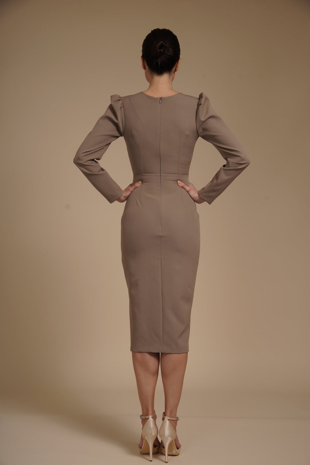 Rochie eleganta midi conica din crep elastic Greige, cu maneci lungi si crapatura