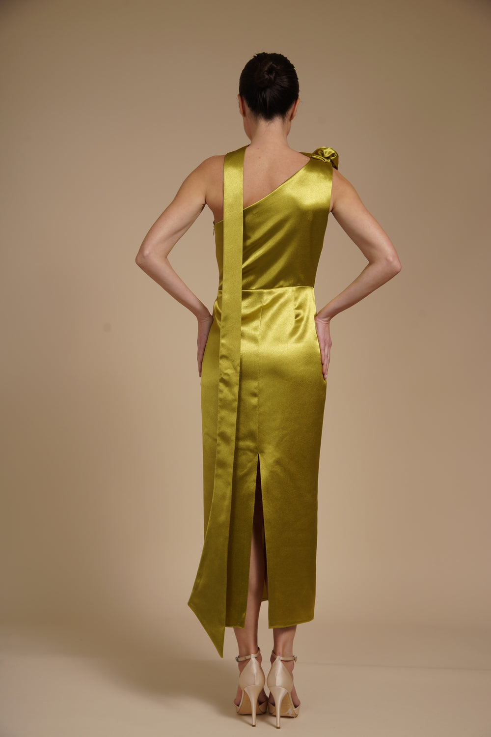 Rochie Fistic midi eleganta din satin pe umar, cu detaliu floral si croiala midi