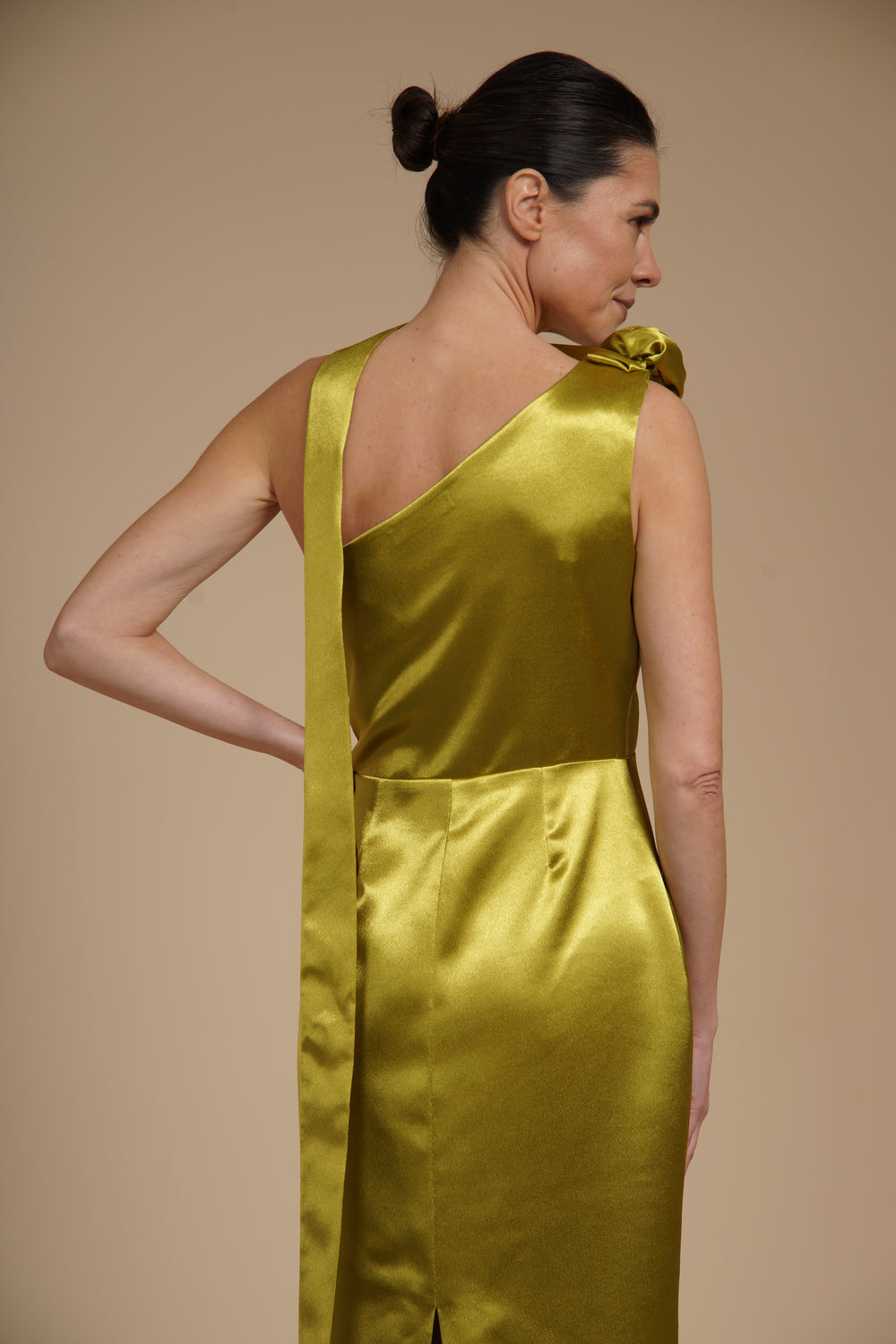 Rochie elegantă midi realizată din satin elastic mătăsos, cu aspect lucios și textură fină ce imită mătasea. Materialul fluid urmărește delicat liniile corpului, oferind confort și o cădere elegantă.