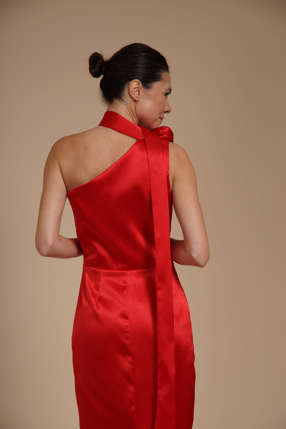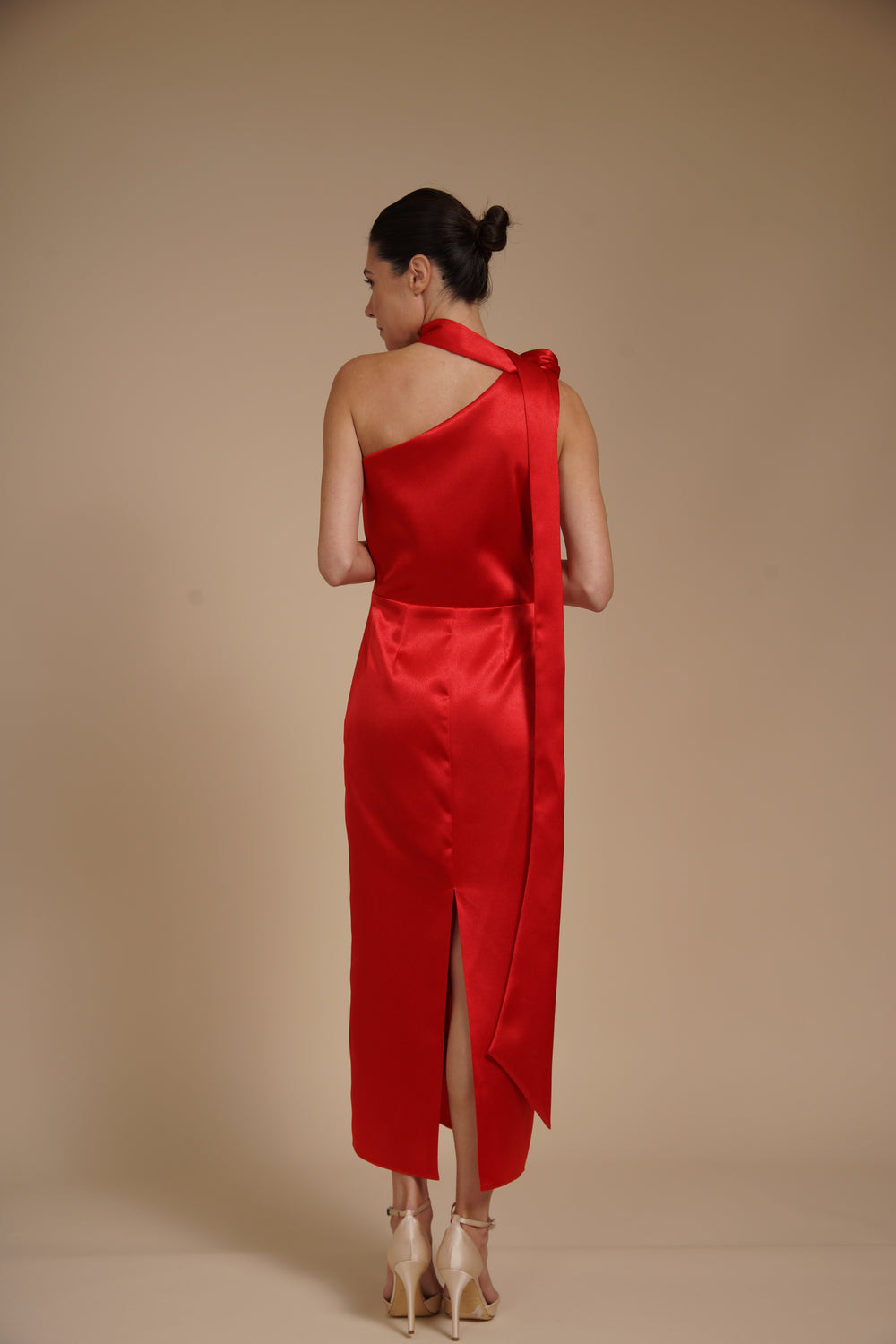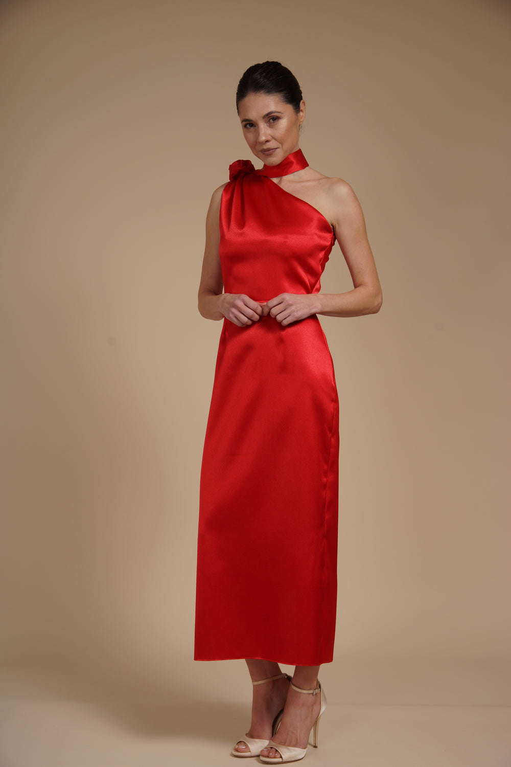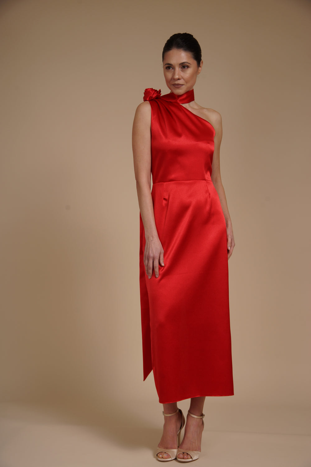 Rochie elegantă midi realizată din satin elastic mătăsos, cu aspect lucios și textură fină ce imită mătasea. Materialul fluid urmărește delicat liniile corpului, oferind confort și o cădere elegantă.