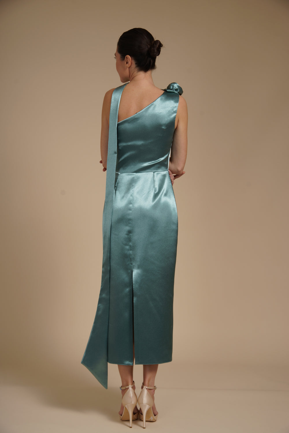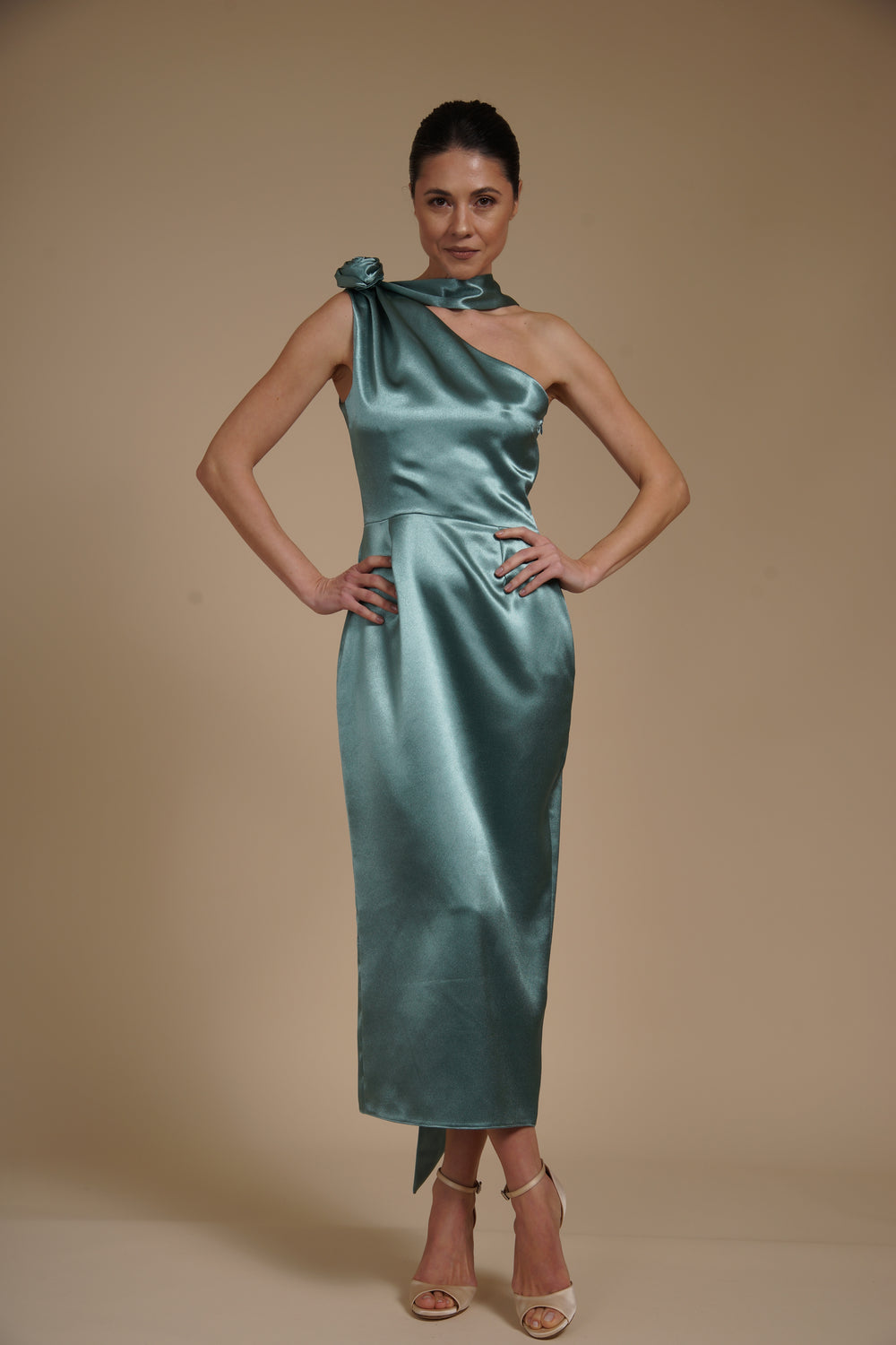 Rochie elegantă midi realizată din satin elastic mătăsos, cu aspect lucios și textură fină ce imită mătasea. Materialul fluid urmărește delicat liniile corpului, oferind confort și o cădere elegantă.