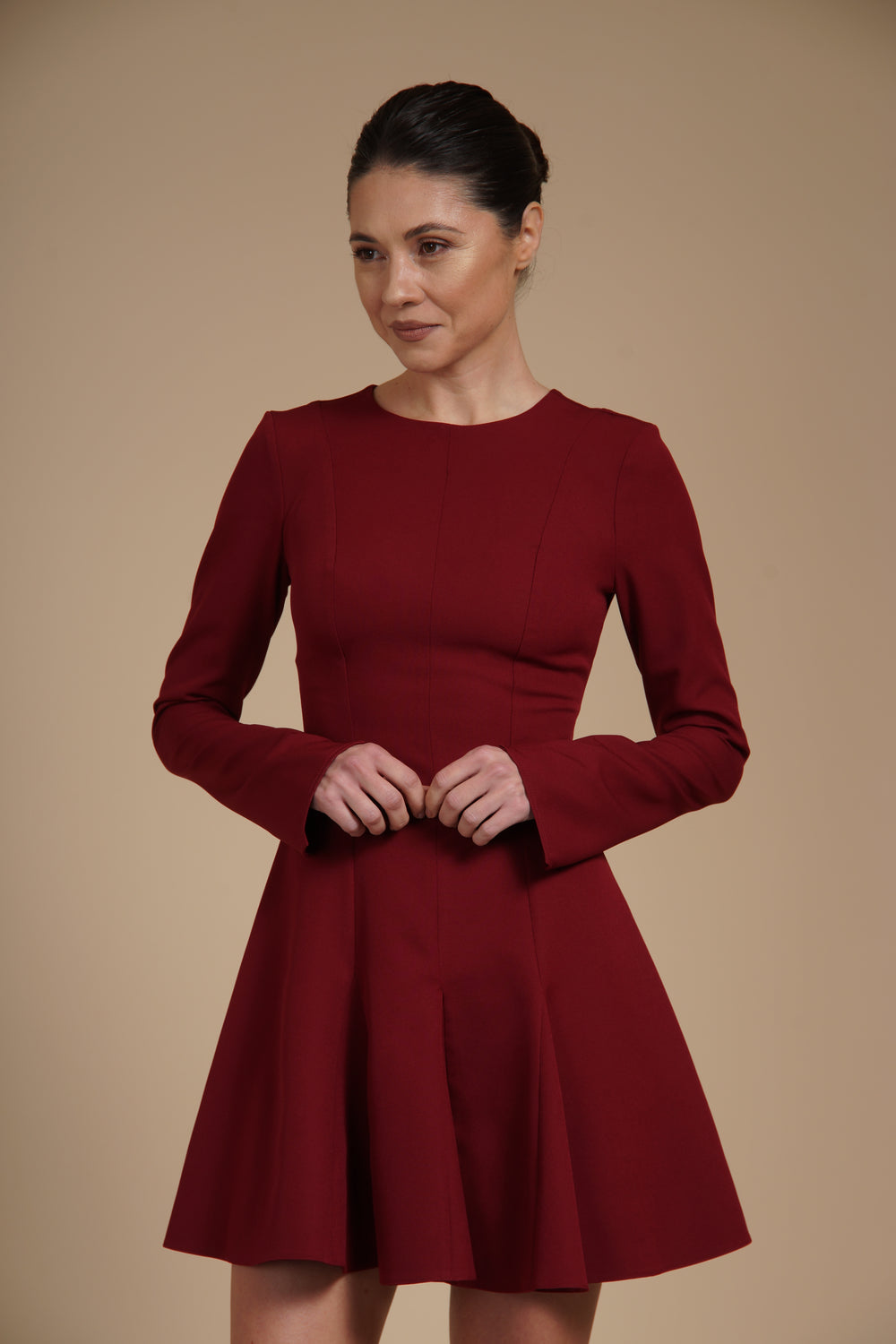 Rochie mini cambrata A-line Bordeaux din crep elastic, cu mâneci lungi
