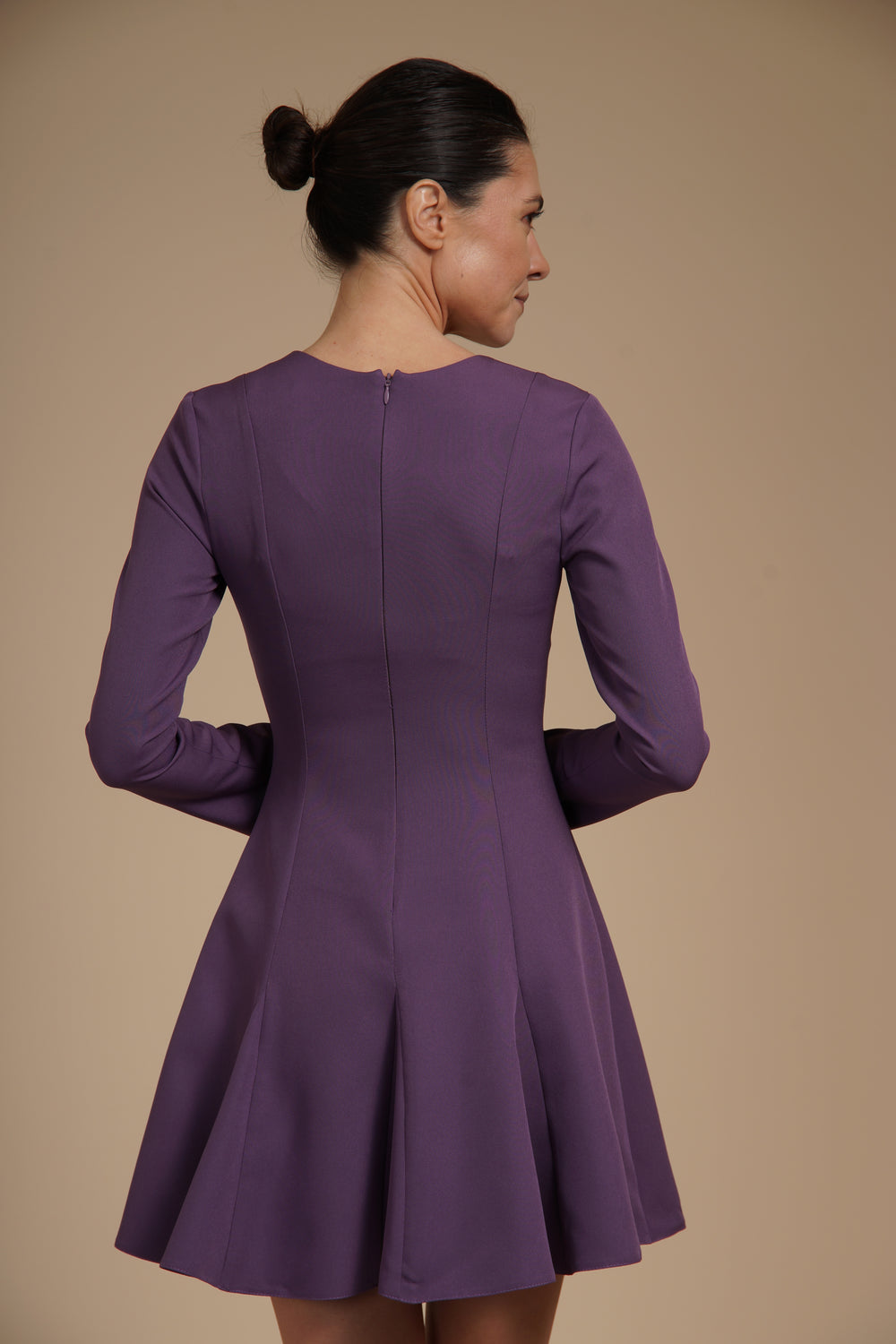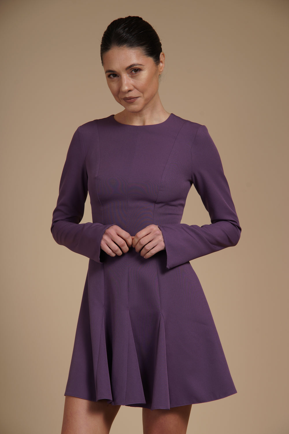 Rochie mini cambrata A-line Mov din crep elastic, cu mâneci lungi