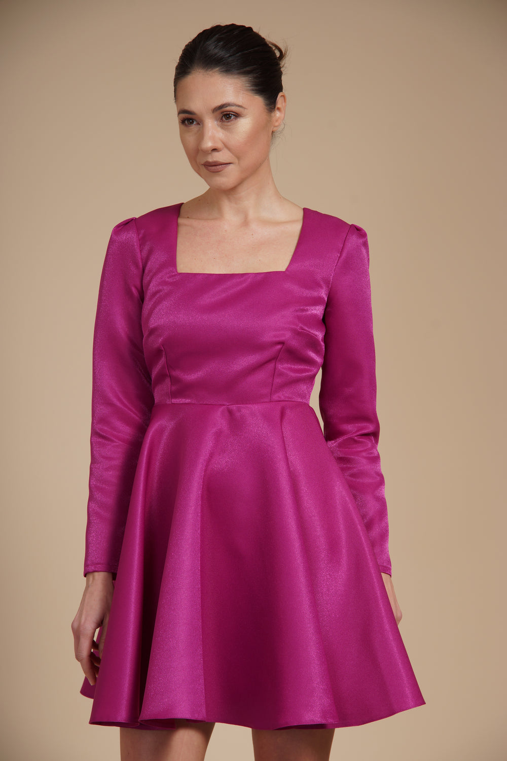 Rochie mini eleganta din tafta fixa gloss Fucsia, cu croi tip A, decolteu patrat si maneci lungi